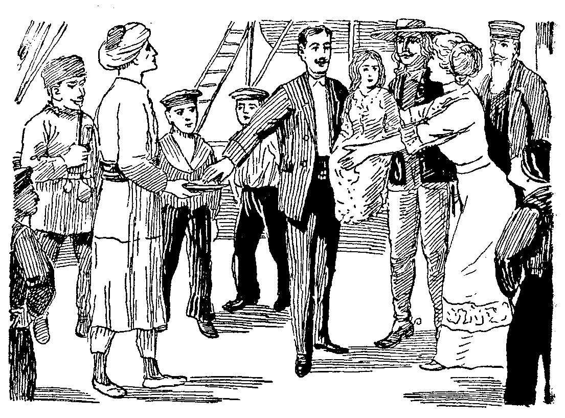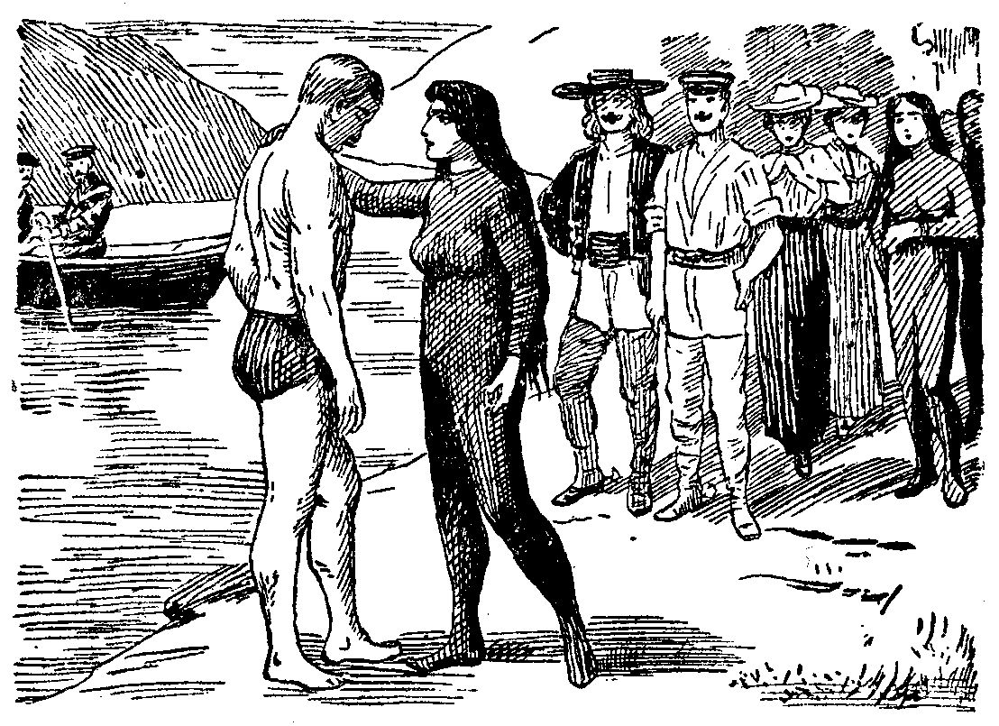 Jetzt tauchten auf dem erhöhten Vorderdeck einige Weibergestalten auf, alle in solche trikotähnliche goldene oder silberne Schuppenkostüme gehüllt, nur das Gesicht frei und keine Kopfbedeckung tragend, die durchweg schwarzen Haare flatterten im leichten Winde.