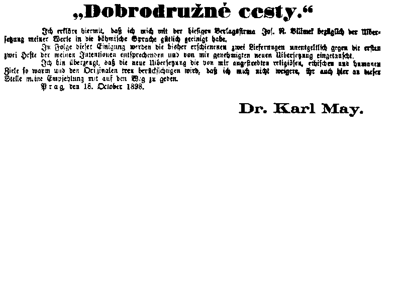 Mays Erklärung erschien bereits am 15. Oktober in der Wiener Tageszeitung »Vaterland« mit dem Titel »Eine Verwahrung des Dr. Carl May«. (21) Aber auch tschechische Zeitungen nahmen den Vorfall zum Anlaß breiter Erörterungen, so beispielsweise »Katolicke listy« am 16. Oktober in ihrer Nr. 284 und »Nasinec« am 30. Oktober in der Beilage zu Nr. 123. Die Mitteilung von der gütlichen Einigung erschien in der »Bohemia« an Mays Abreisetag, dem 19. Oktober:
